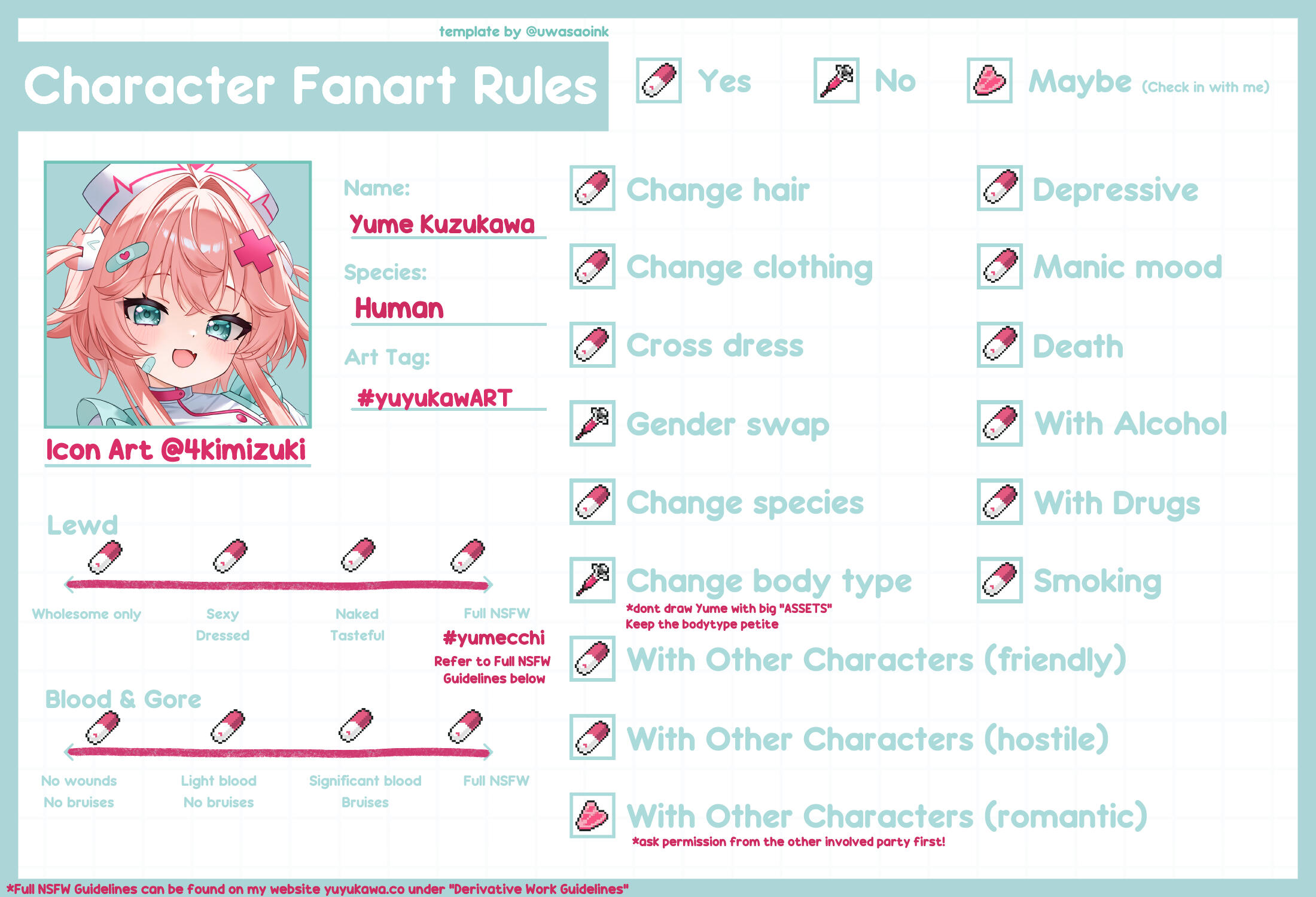 • Acceptable standards for adult content (NSFW) are dealt with on a case by case basis, so please comply with general socially acceptable standards which prohibit, extreme fetish content, If the criteria is not clear, or you are not sure if your artwork complies with the guidelines for derivative work, please contact Yume using their contact form.
